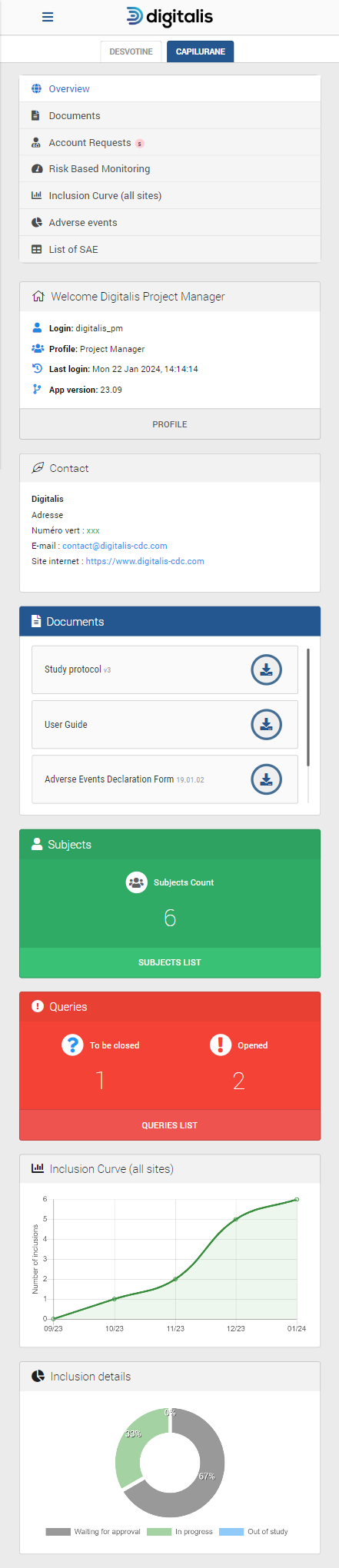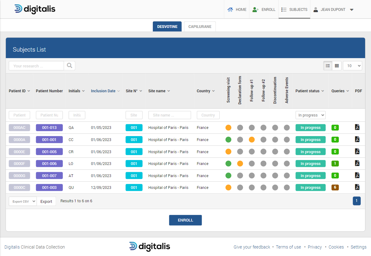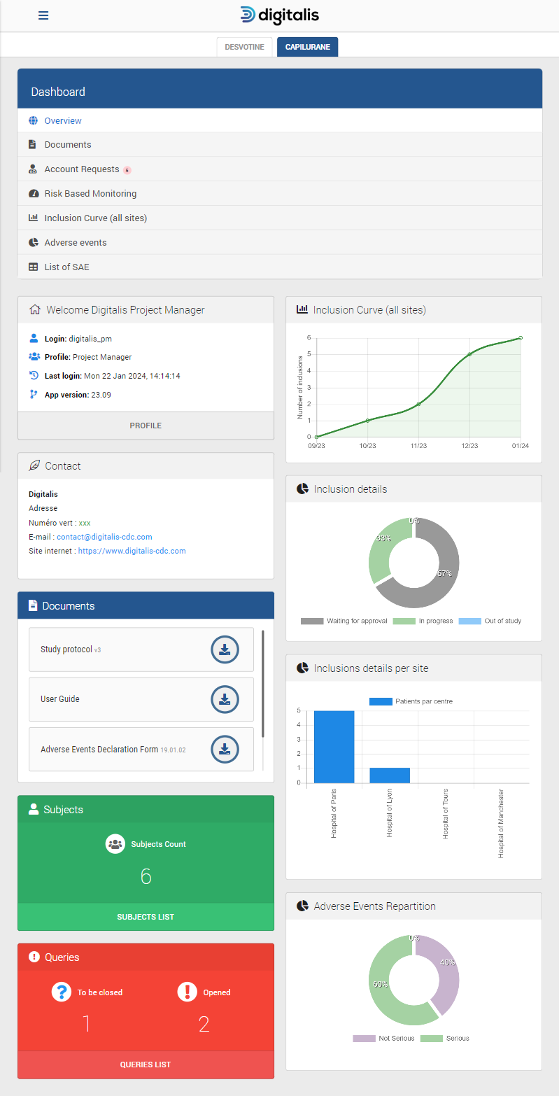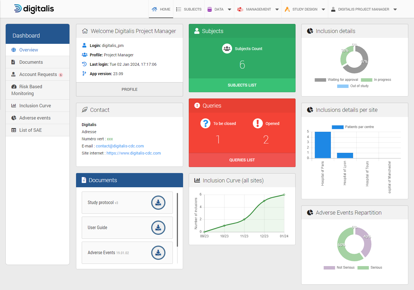 Digitalis is an innovative data collection tool (Electronic Data Capture). Digitalis provides you with all the tools you need for a pleasant and complete collection and management of quality clinical data. It is a dynamic and ergonomic web application, whose strength lies in its ease of use and ability to adapt to your specific needs.