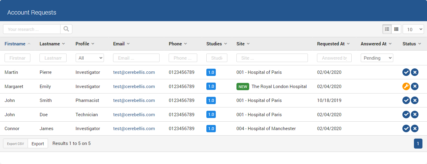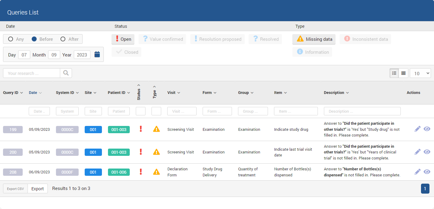 Manual submission by the CRA directly on the patient form or automatic creation via programmed consistency checks. The investigator can correct the error or explain the reason for the inconsistency. A dedicated module enables queries to be managed and supervised.