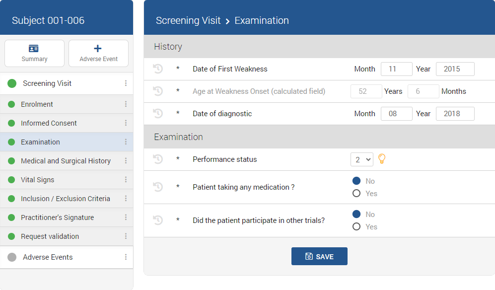 Find your visits in an ergonomic menu and the selected form in an input space. The form can be enhanced with diagrams and instructions for investigators.