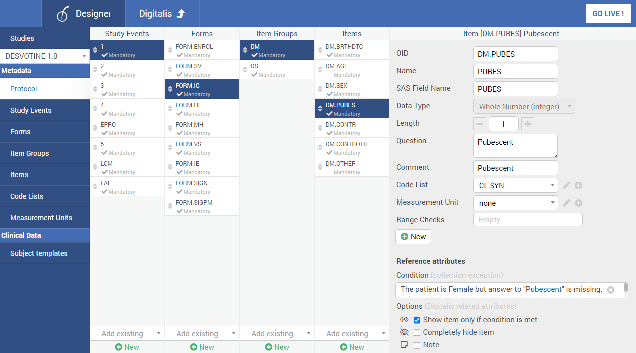 Digitalis integrates ODM Designer, an intuitive solution for designing and modifying CRFs, compliant with the CDISC ODM-XML standard. With one click, changes made in ODM Designer are immediately deployed to the test CRF.