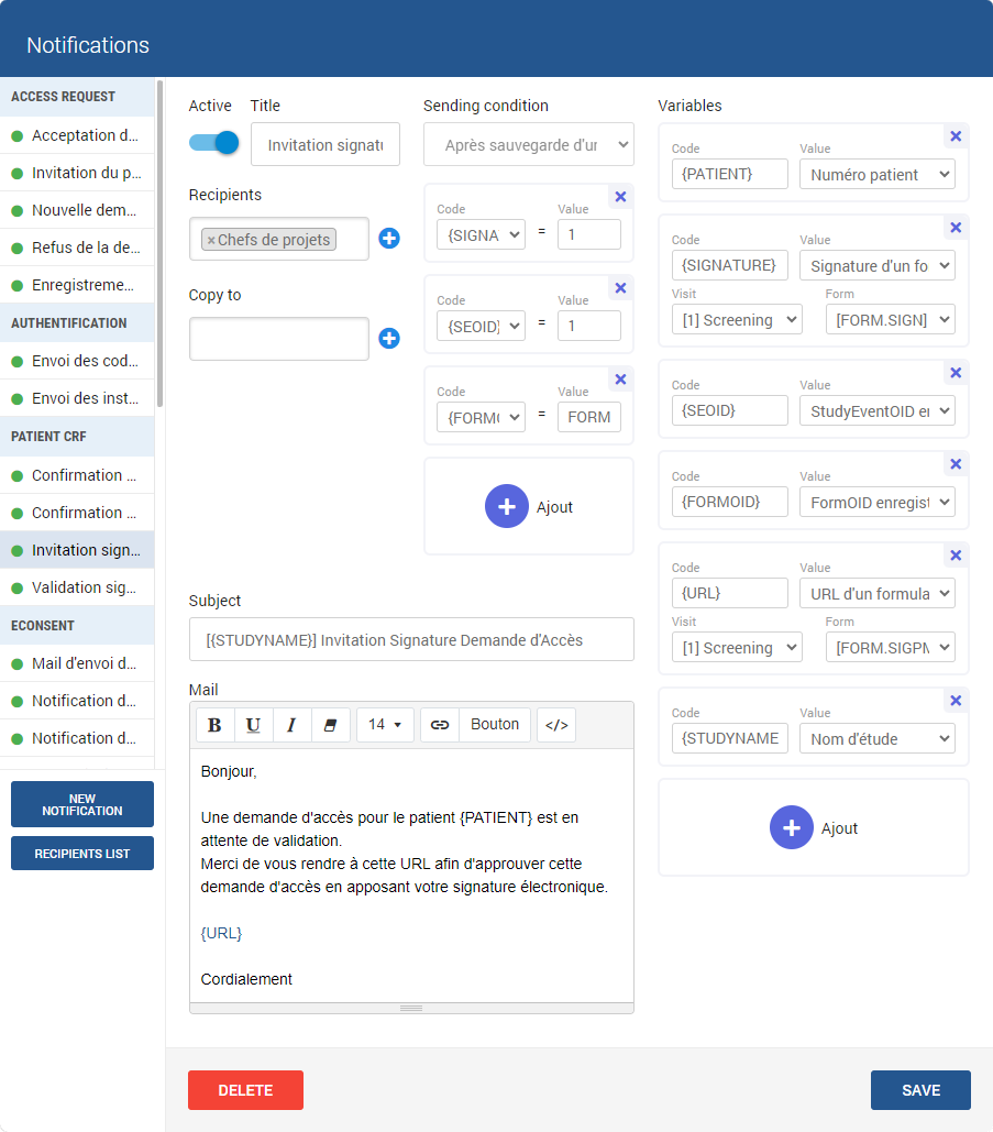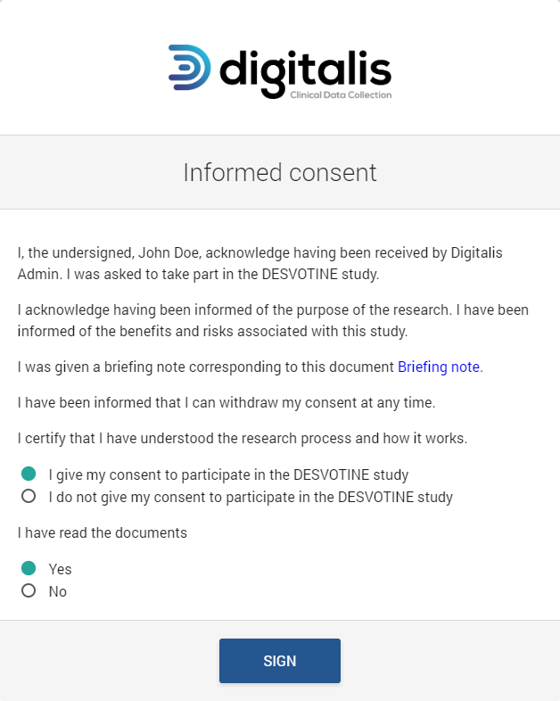 When an eConsent is created, an e-mail is sent to the patient asking them to read the text and answer the quiz. The patient can then access the signature via SMS, with a code to be entered in the dedicated interface. This signature unlocks the possibility for the investigator to include the patient in the study.