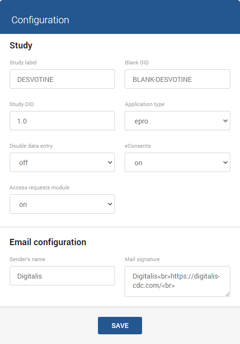 Configure global study parameters: ePRO, informed consent, forms, workflows, etc., independently of other studies
