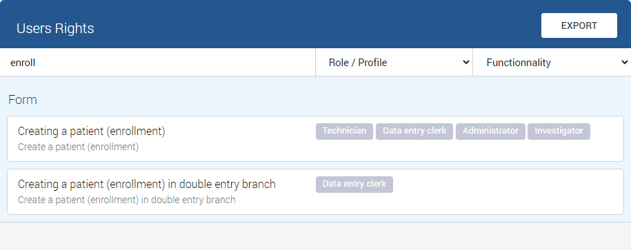 Configure access rights for different profiles: who can enter queries? Who can manage users? Access a comprehensive, exportable access rights management table to assign profiles to rights.